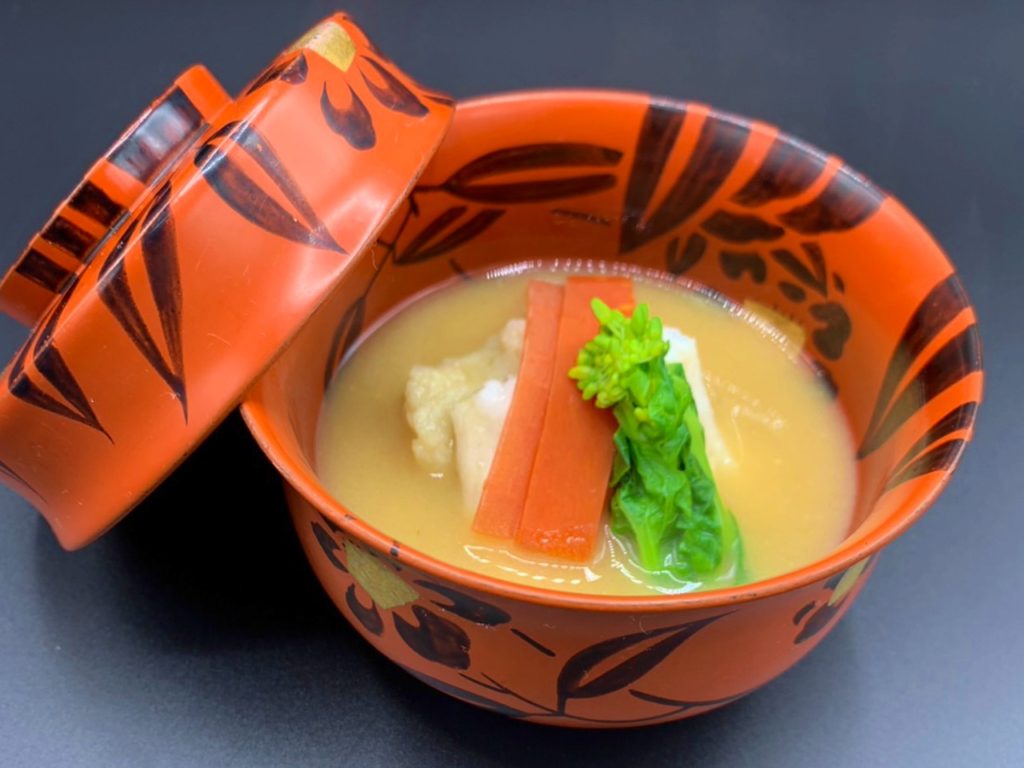・お椀替り 白味噌仕立て〜穴子葛焼き、蓮根寄せ、菜の花〜